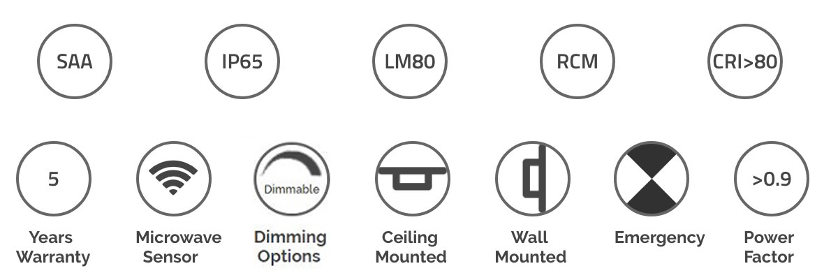 • Dimmable / Microwave Motion Sensor / Emergency Battery Back Up Options